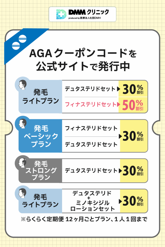 予算内で計画的なAGA治療をするなら、DMMの最新クーポンコードとの相性が良いでしょう。